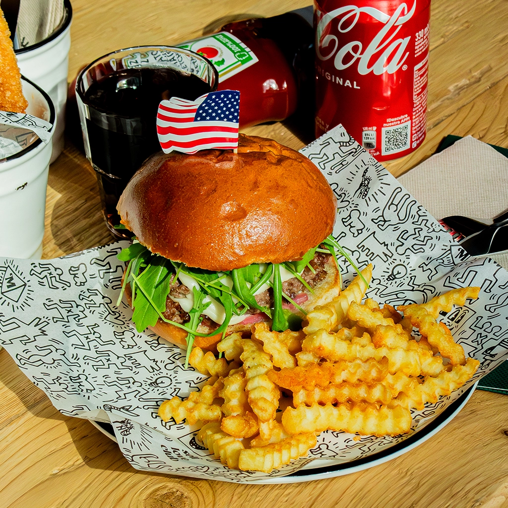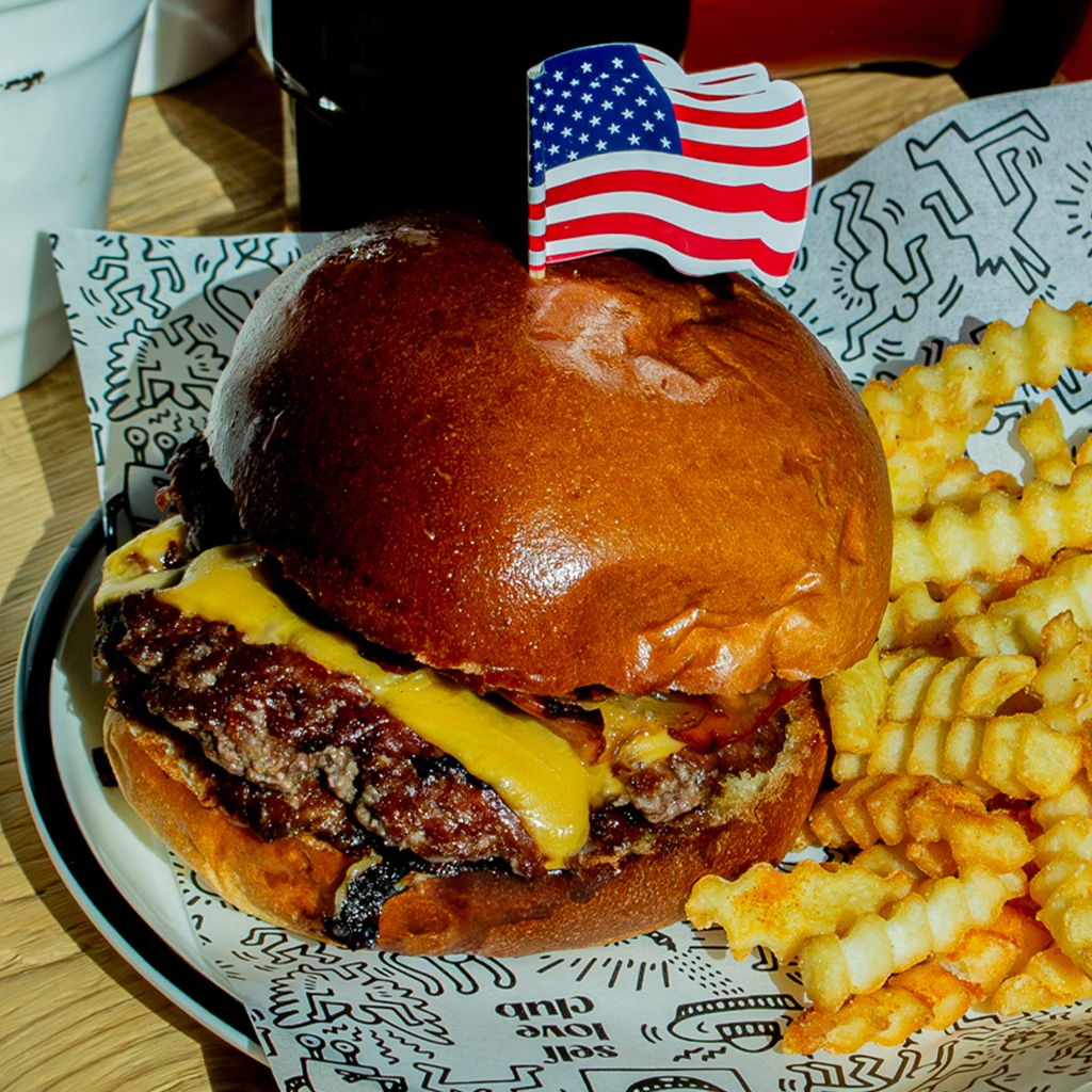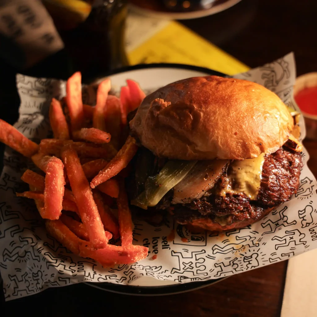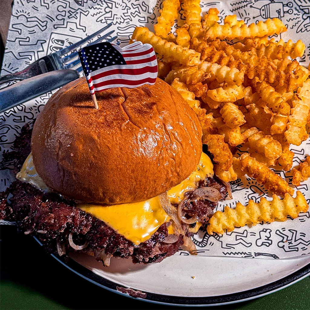 Entre dos mitades de un donut: cebolla crispy, mantequilla de cacahuete, bacon crujiente y queso americano fundido. Acompañada de patatas crinkle. 🥓🧀