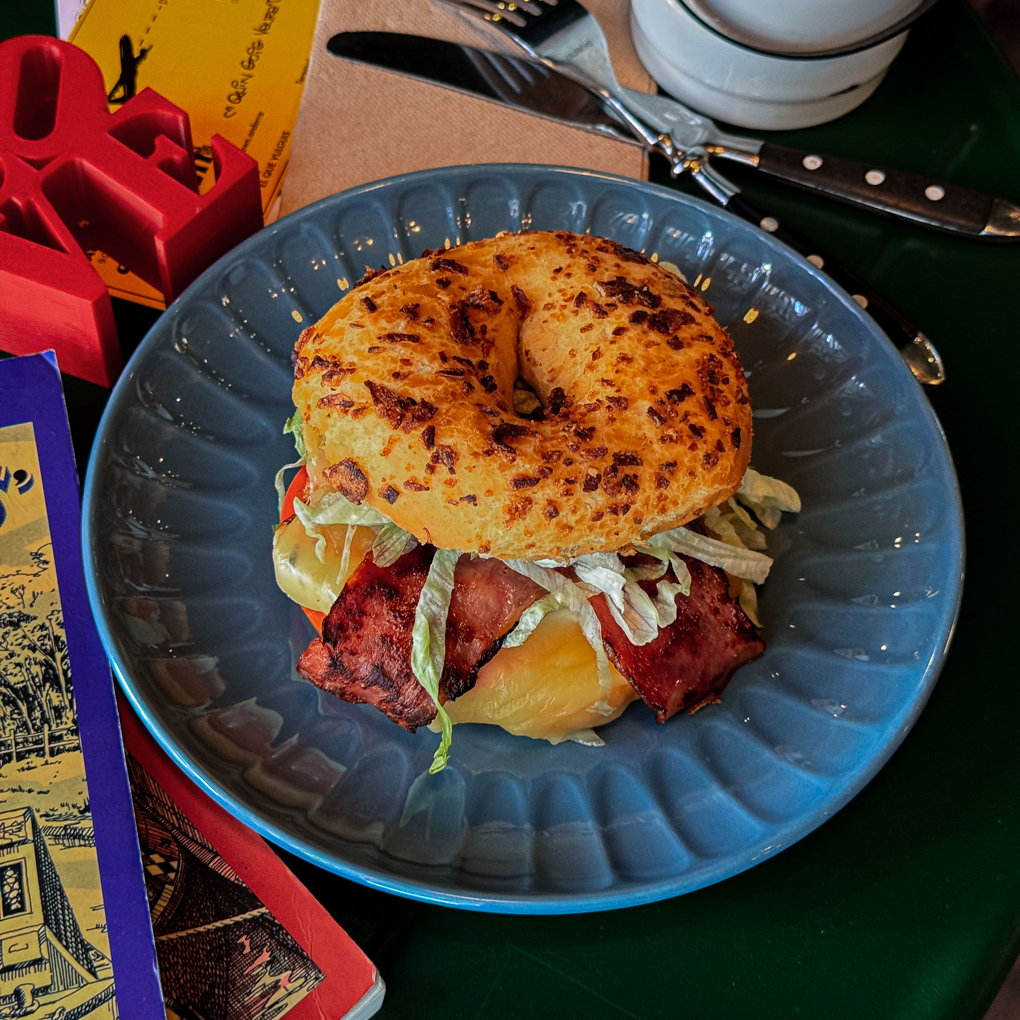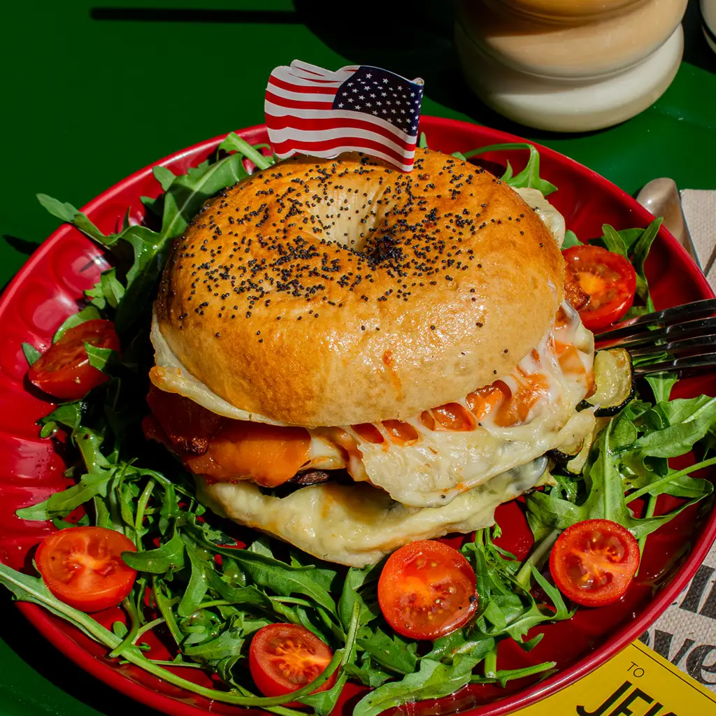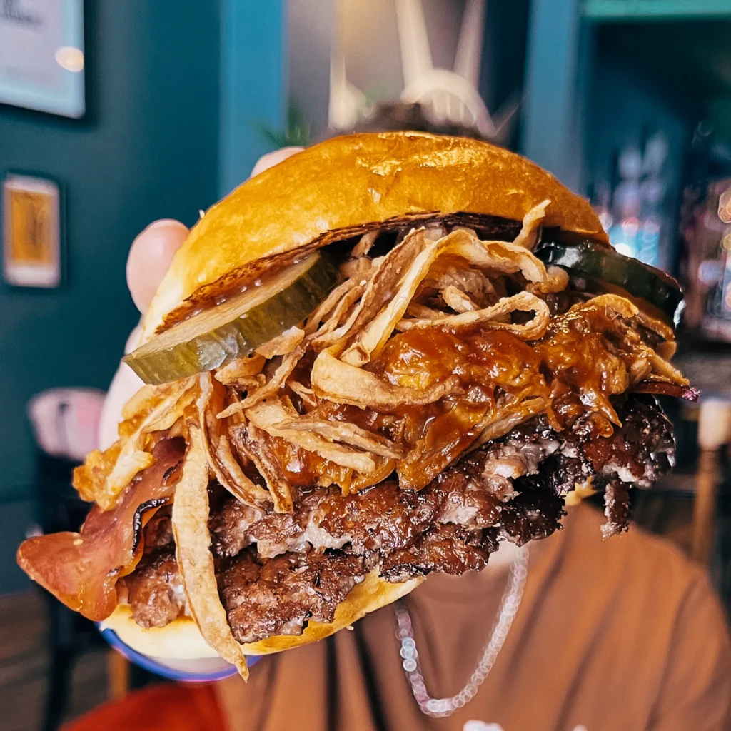 Entre dos mitades de un donut: cebolla crispy, mantequilla de cacahuete, bacon crujiente y queso americano fundido. Acompañada de patatas crinkle. 🥓🧀