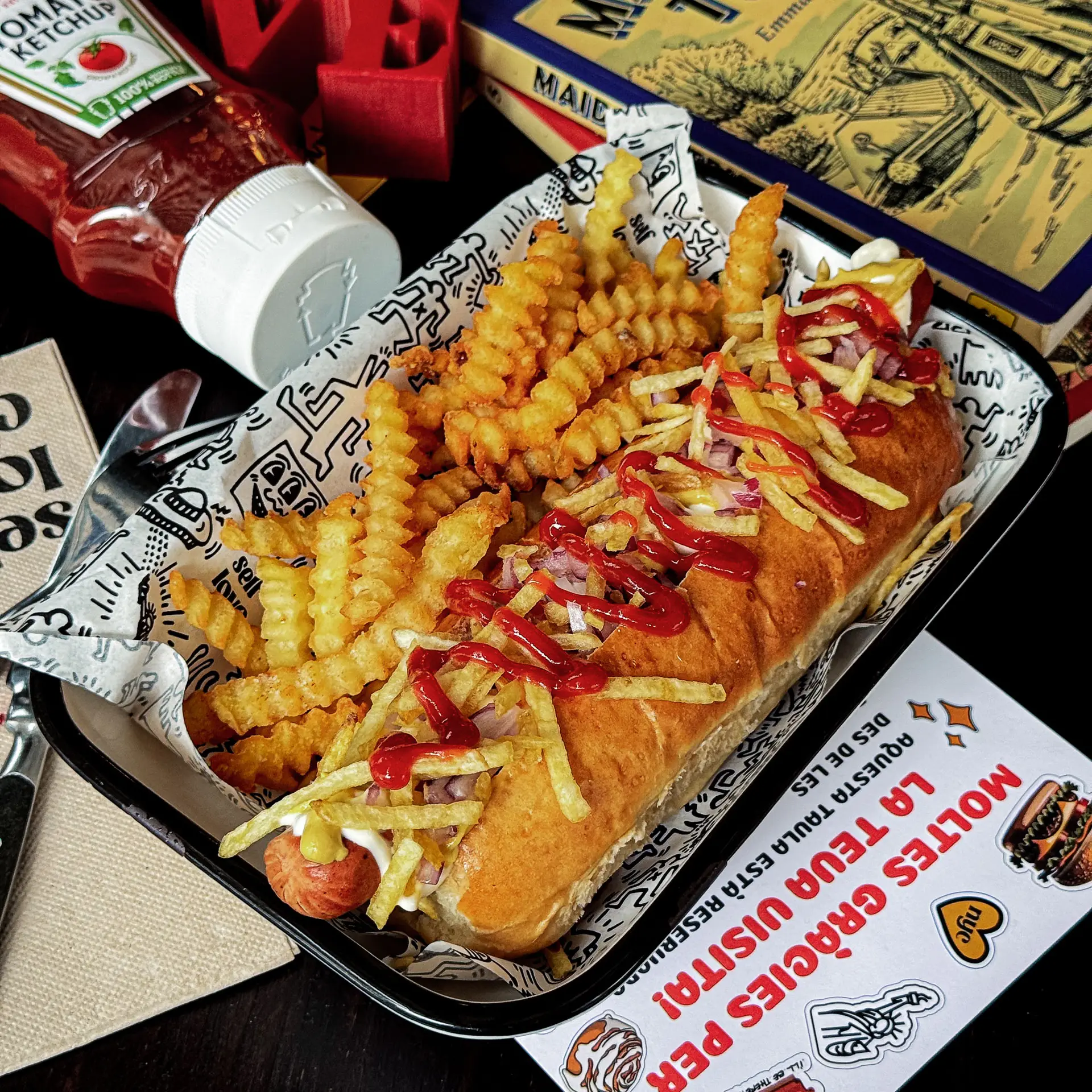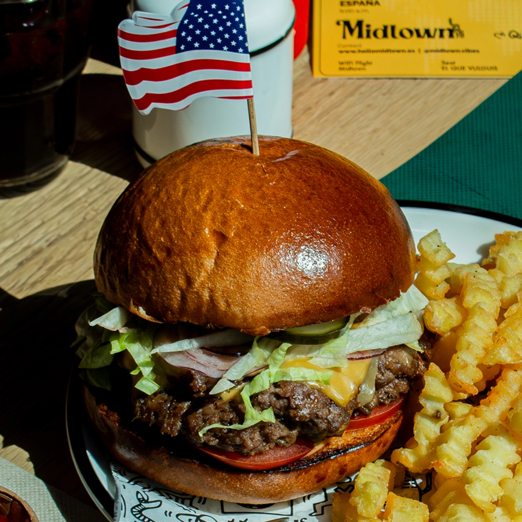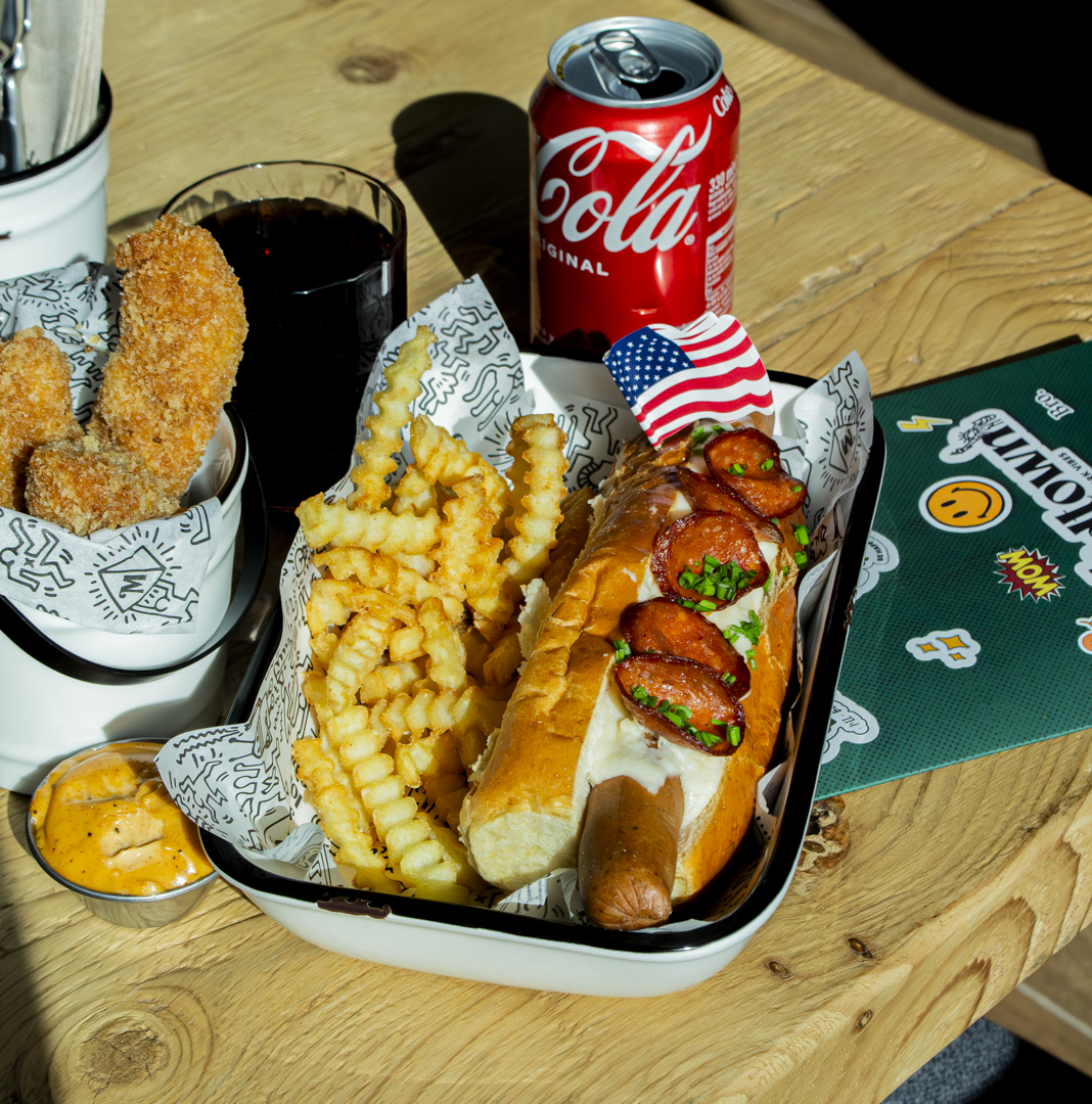 🔥 Pan artesanal con Frankfurt jugoso, mostaza, mayonesa cremosa, cebolla en brunoise, bacon crujiente y patatas paja. ¡Viene con patatas! Un clásico reversionado al estilo Midtown.
