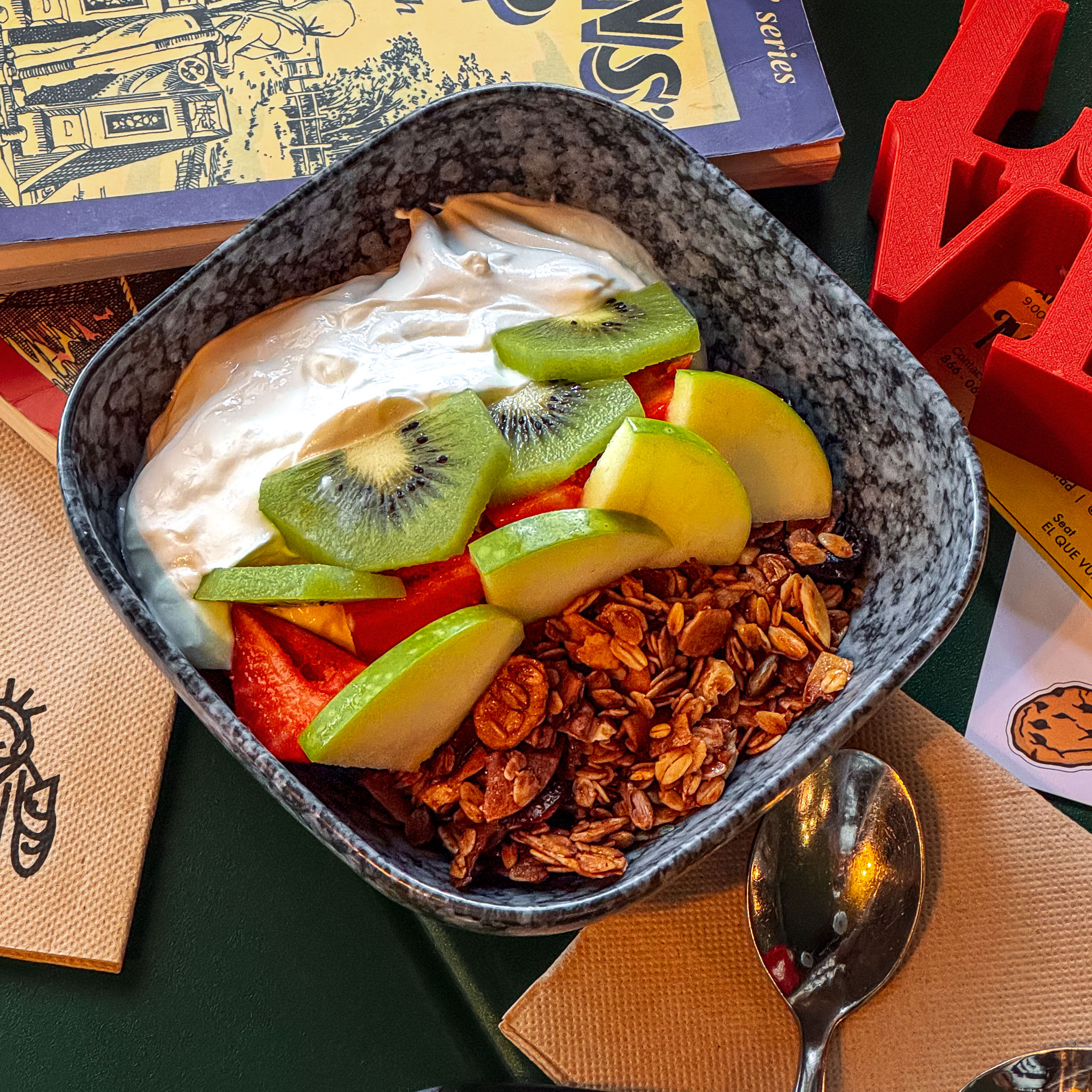Nuestra granola artesanal (avena, coco, frutos secos y miel) con yogur griego y fruta de temporada. Energía pura en cada mordisco. NEW🔥