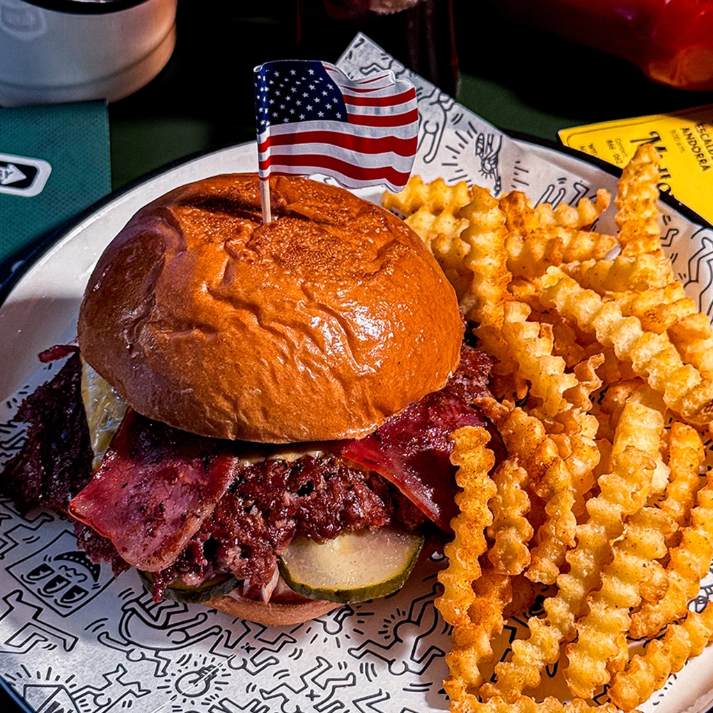 Una combinación única de sabores locales: bull de donja, butifarra auténtica... Le sumamos calçots y nuestra salsa romesco casera, que es una receta secreta familiar! Agreguemos tomates frescos y cheddar. disfruta de un mordisco de la herencia a cada bocado. unete a la celebración andorrana con sabor!