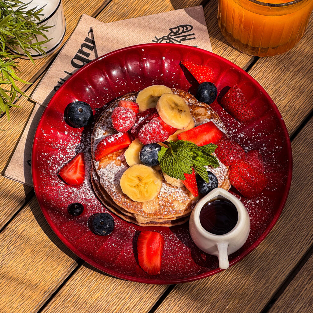 Torre de pancakes esponjosos acompañados de frutas de temporada, azúcar glass y sirope de AECE. ¡El desayuno dulce que nunca pasa de moda!! 🥞🍓🍯 👉 SÓLO DISPONIBLE POR LA MAÑANA!