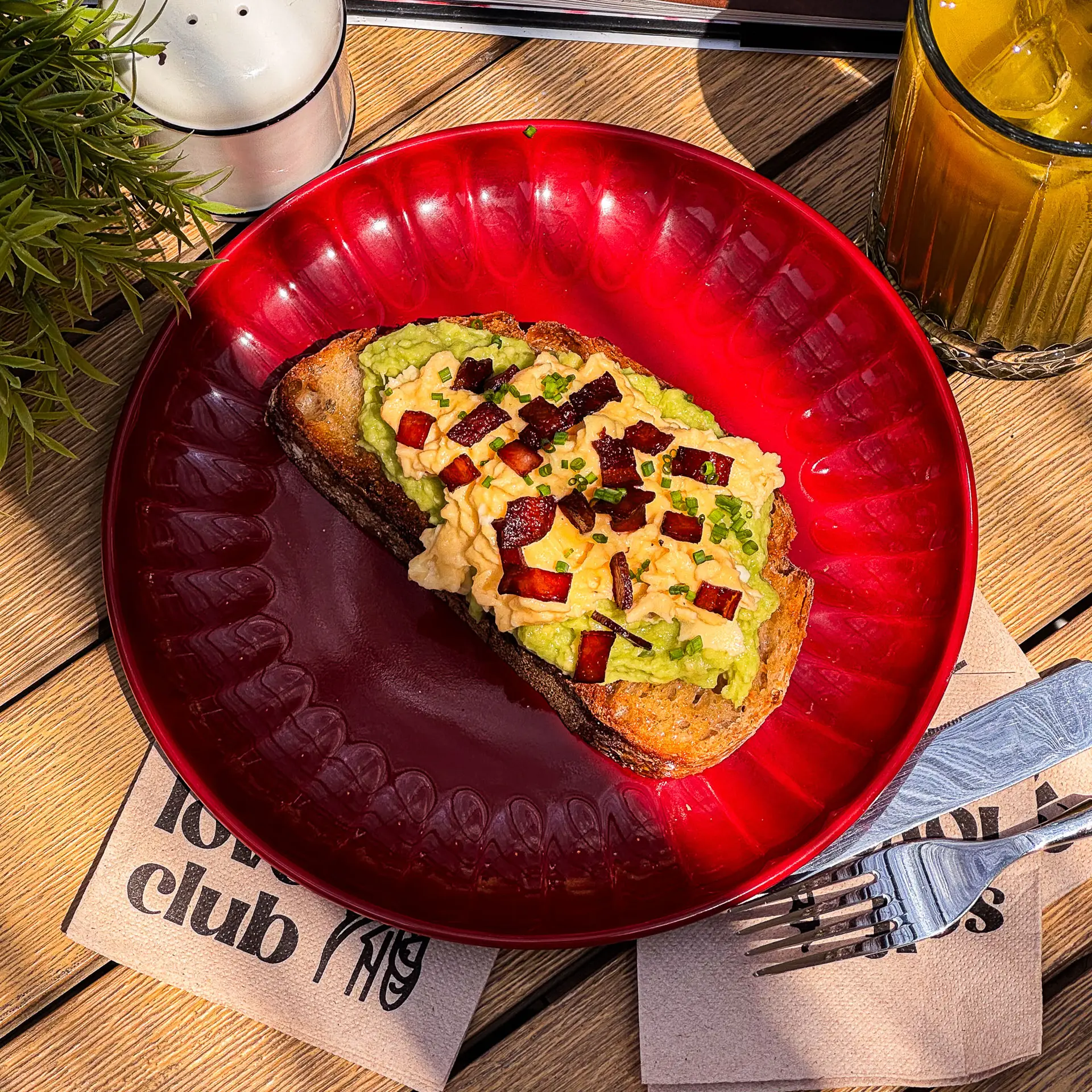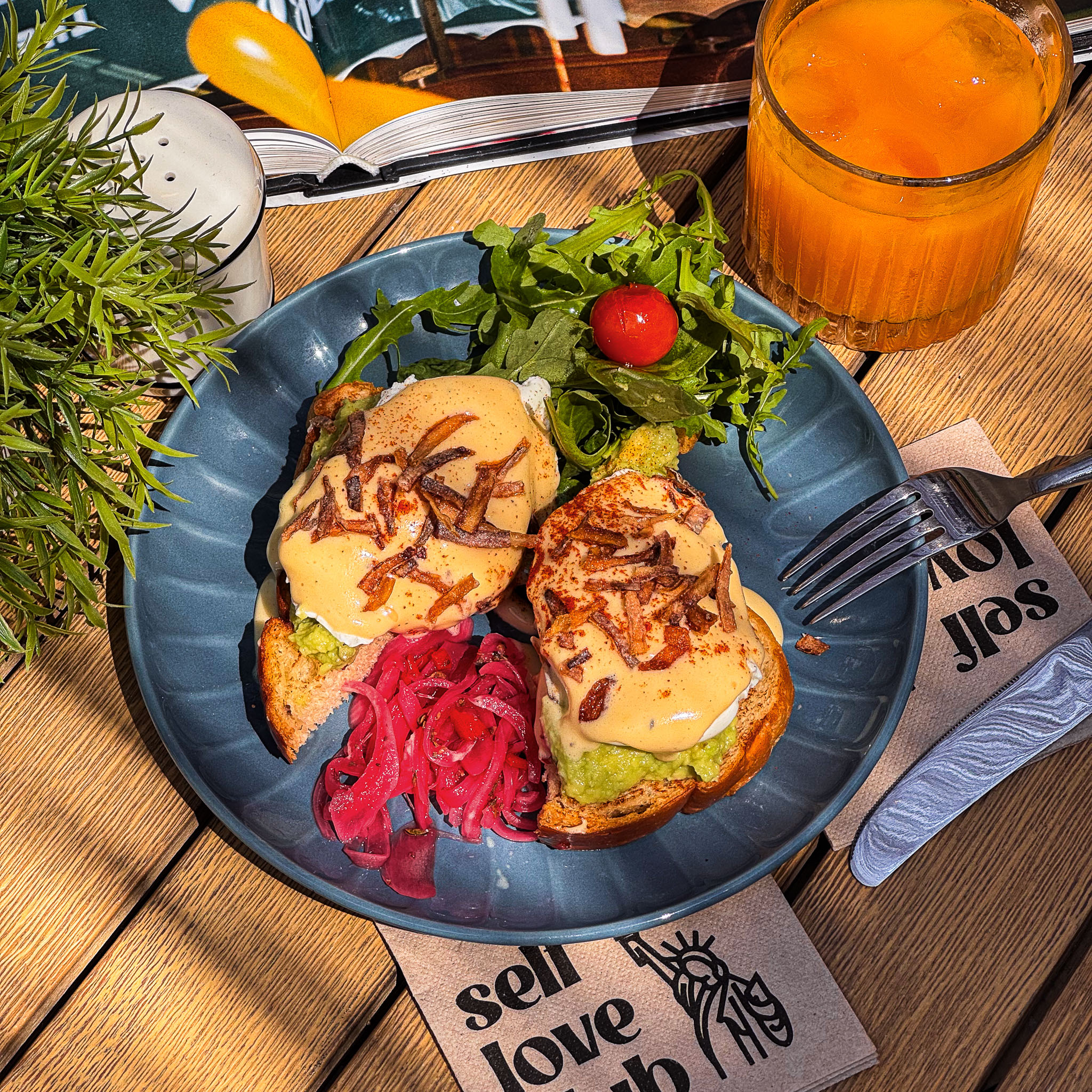Pan blanco artesanal con guacamole cremoso, huevos poché, salsa holandesa, cebolla crujiente, un toque de pickles y verdes. NEW🔥