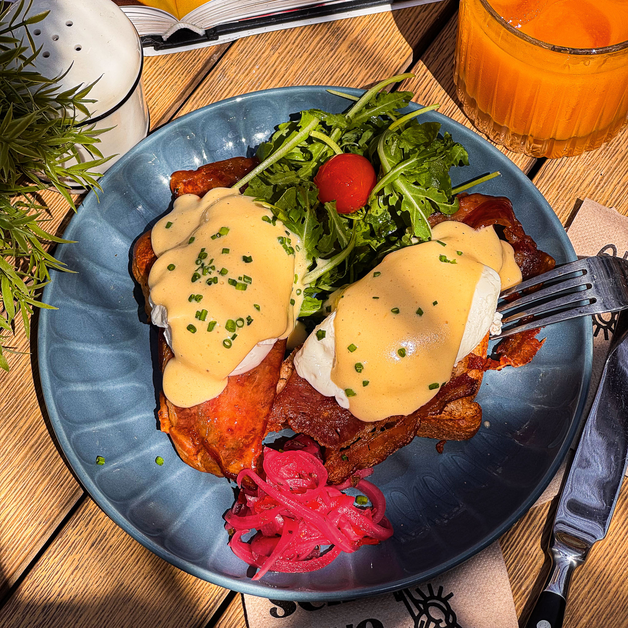 Pan blanco tostado con huevos poché, bacon crujiente, salsa holandesa, pickles y verdes. El brunch más clásico y perfecto. NEW🔥