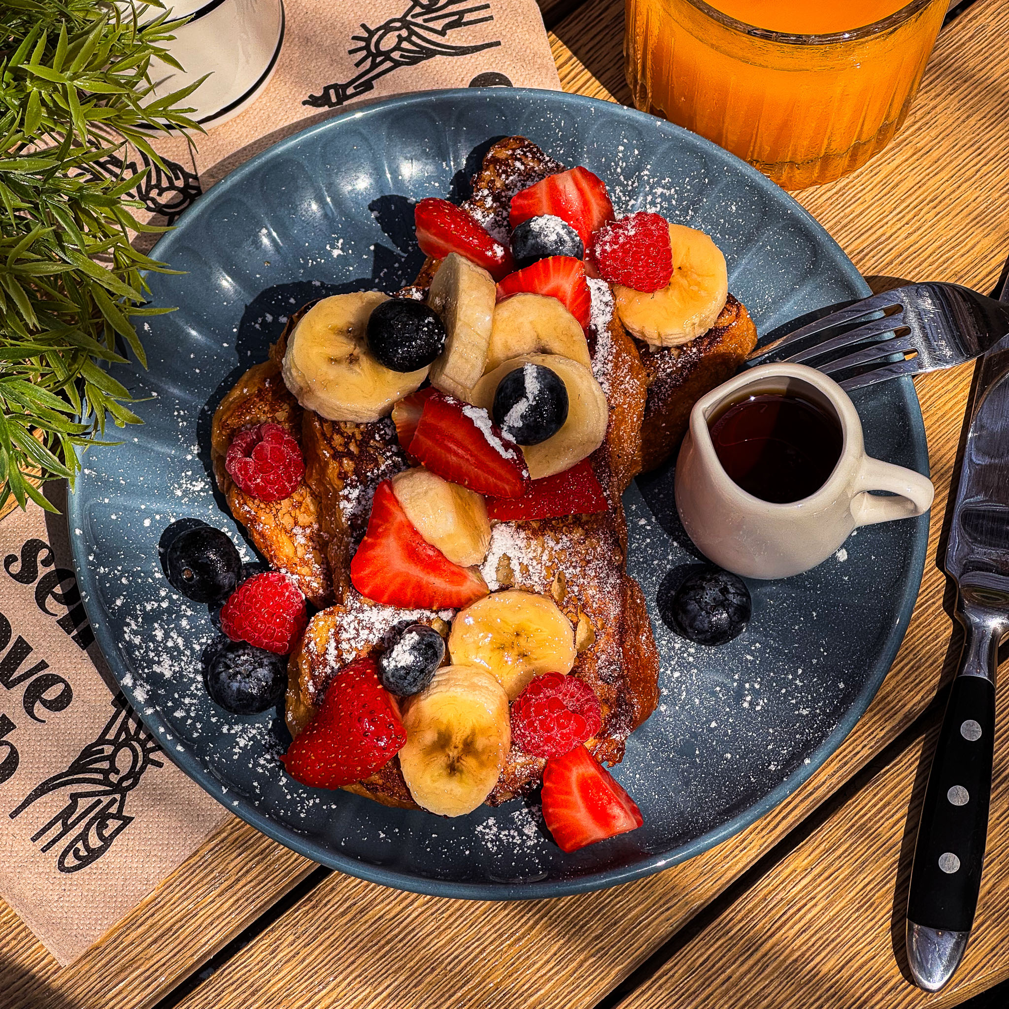 Pan BRIOCHE caramelizado con fruta de temporada y un chorrito de miel natural. Un desayuno ligero y fresco.NEW🔥👉 SÓLO DISPONIBLE POR LA MAÑANA!
