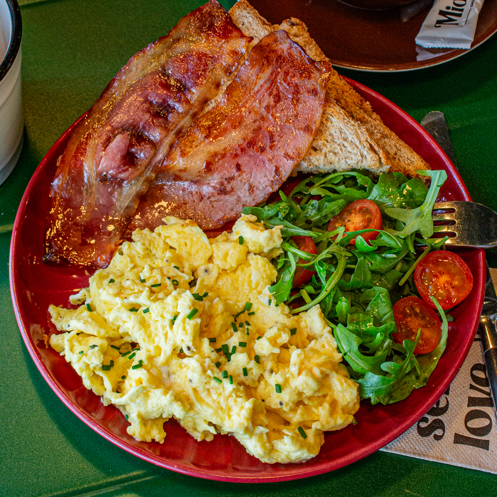 Huevos revueltos acompañados de bacon y verduras frescas, servidos con pan artesanal. ¡La combinación ideal para un brunch delicioso y saludable! 🍳🥓🌿